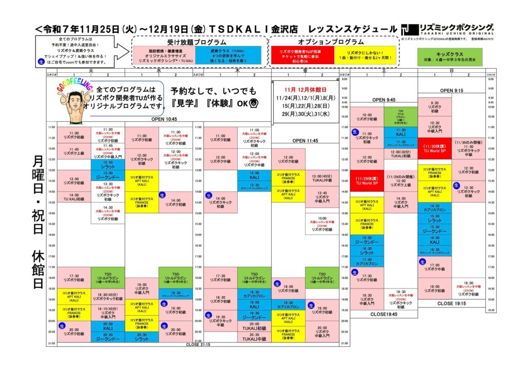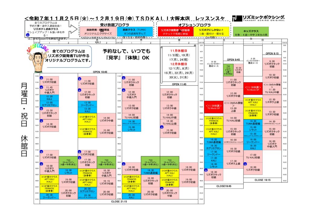 | 10 : 45 〜 21 : 15 | 11 : 45 〜 21 : 15 | 9 : 45 〜 19 : 45 | 9 : 15 〜 19 : 15 | 月曜日・祝祭日 | ||